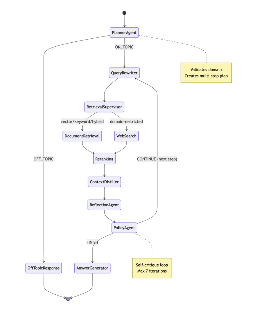 Our system uses 7 specialized AI agents working together through a state machine, with each agent handling a specific aspect of intelligence: