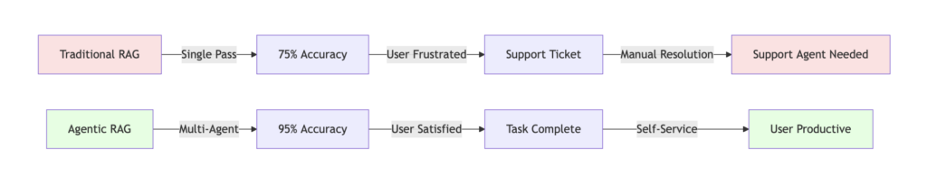 Agentic RAG transforms the process by introducing multiple specialized agents that work together, plan research strategies, and self-correct their approach.