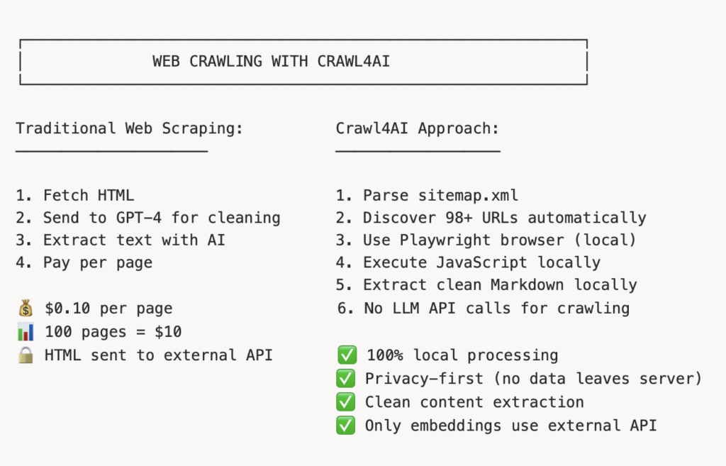 Beyond searching internal documents, Agentic RAG can also ingest content from your website and documentation portals using Crawl4AI – a privacy-first web crawling solution.